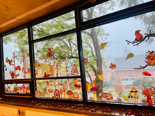 In die Klasse 2a von Frau Redmann ist der Herbst eingezogen. Die Klasse 2a hat ein wunderschönes Fensterbild zum Thema Herbst gestaltet. Auf Birkenstämmen sitzen Eichhörnchen, Blätter wehen durch die Luft, am Boden wachsen viele Pilze und die Igel sind aktiv.