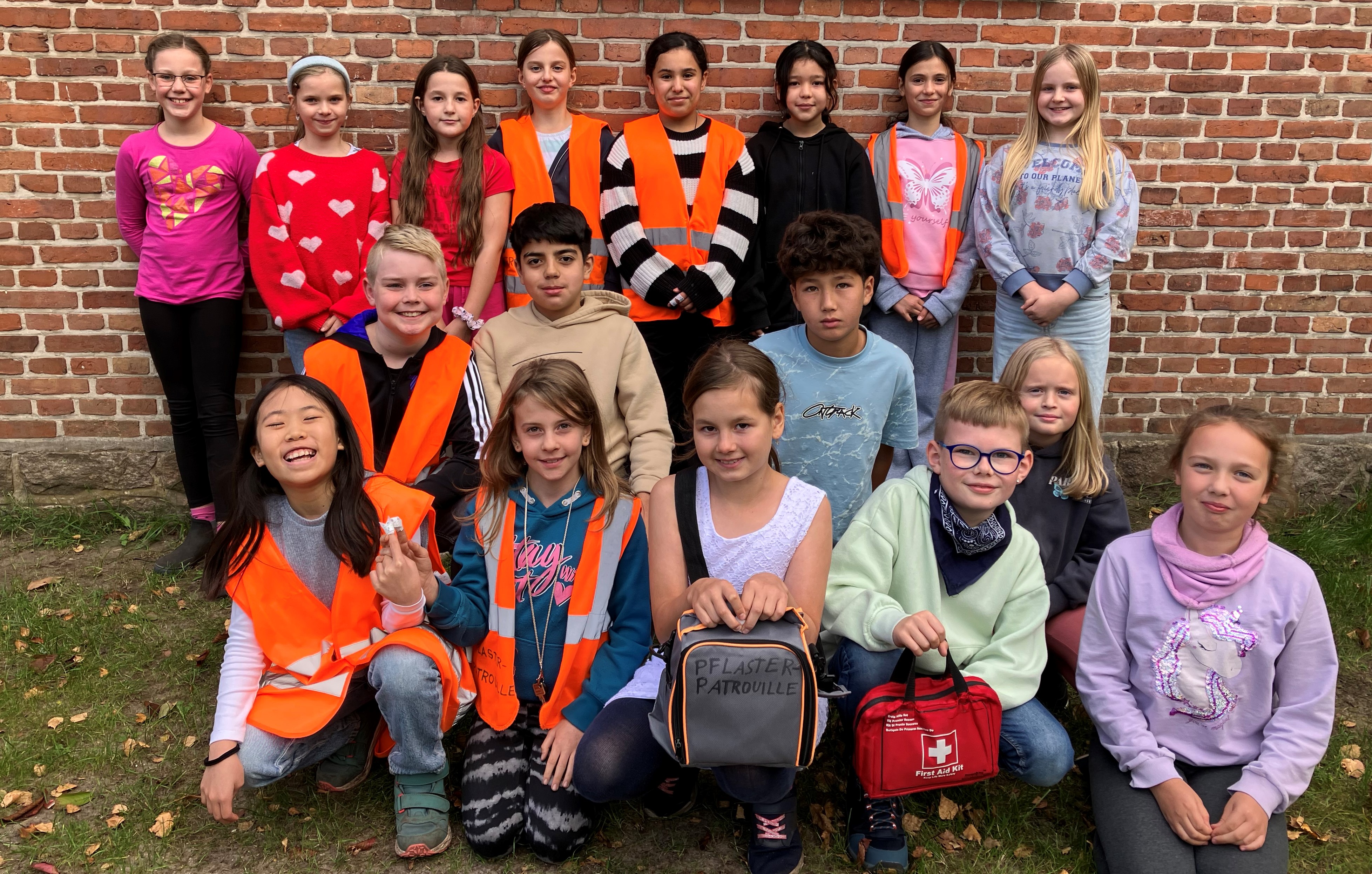 In der großen Pause laufen jeweils 2 Kinder der Pflasterpatrouille ausgestattet mit Pflastern und Kühlpacks über den Schulhof um 1. Hilfe zu leisten.